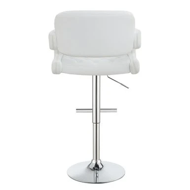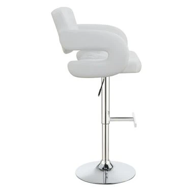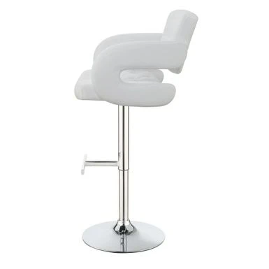 A rec room or home bar never had such chic bar seating. Chrome finish leg and base with shimmering white upholstery. Cushioned seat adjusts to maximize your presence, with chrome footrest to help maintain your perspective. Padded armrest allows you to lean comfortably in to make your point or sit back and nurse a martini. Trendy yet practical, bar stool is a modern enhancement to your home entertainment.