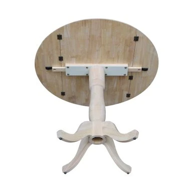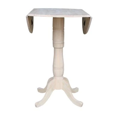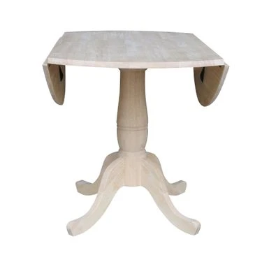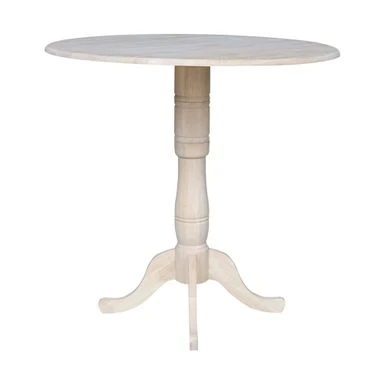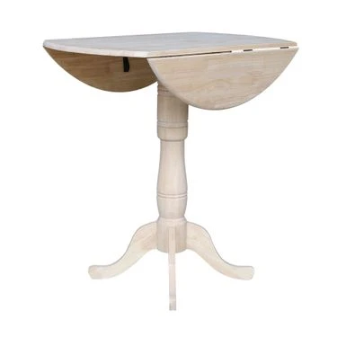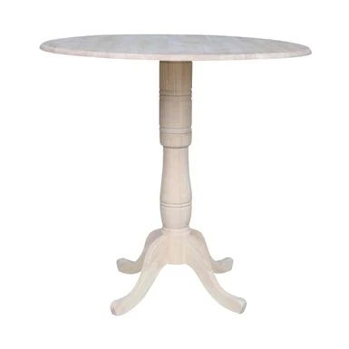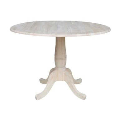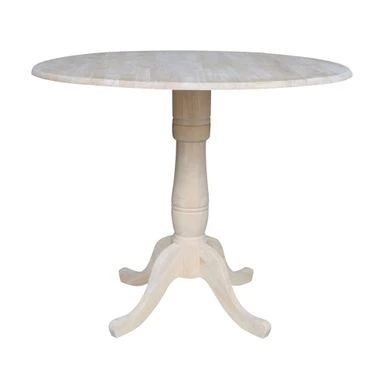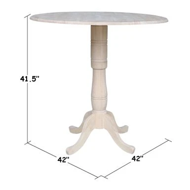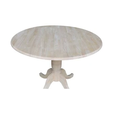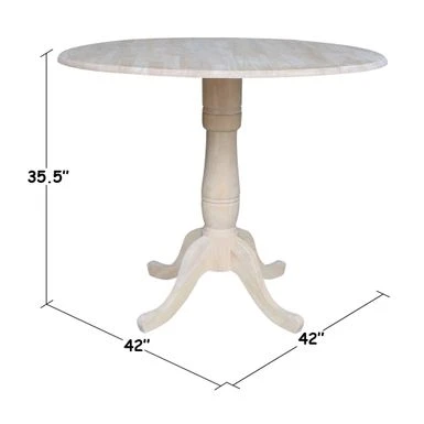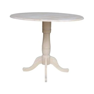 Introducing the International Concepts 42″ Round Pedestal Dual Drop Leaf Table in unfinished parawood, a sturdy and sustainable hardwood. This versatile piece can be customized with your desired stain or paint to perfectly match your décor. The classic design features a butcher block tabletop and a pedestal base with four feet for exceptional stability. Use it with dining chairs, counter height stools, or bar height stools with its adjustable height options. The dual drop leaf design adds extra versatility and convenience to your space.