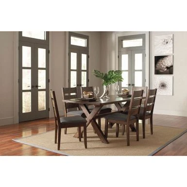Greet guests with rustic country allure by offering a seat at this seven-piece dining table set. The X-style frame of the table with its live edge design gives this dining set the country charm you are seeking. Greet guests with rustic country allure by offering a seat at this seven-piece dining table set. The X-style frame of the table with its live edge design gives this dining set the country charm you are seeking. Six classic style ladder-back chairs complete the set and feature tapered legs. Take a seat on the cushions and enjoy your next meal with friends and family.