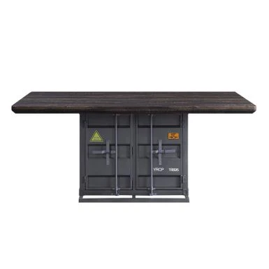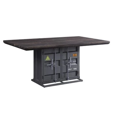 Anchor your dining space in effortless style with the Cargo Dining Room Table. The impressive design elements mix contemporary and industrial themes into one impressive transitional look. Anchor your dining space in effortless style with the Cargo Dining Room Table. The impressive design elements mix contemporary and industrial themes into one impressive transitional look. The unique rectangular table features a pedestal base in an antique walnut finish with gunmetal finish accents that will revitalize any space. With two door and storage compartment, this cargo container style table also provides storage space.