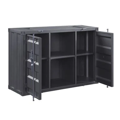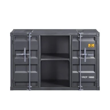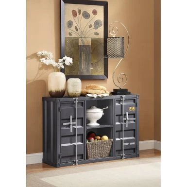 Accent your living or dining space in effortless style with the Cargo Server. The impressive design elements mix contemporary and industrial themes into one impressive transitional look. Accent your living or dining space in effortless style with the Cargo Server. The impressive design elements mix contemporary and industrial themes into one impressive transitional look. The unique rectangular server features a white finish with gunmetal finish accents that will revitalize any space. With two storage and display shelves and two storage compartment this cargo container style server also provides storage space.
