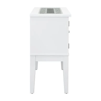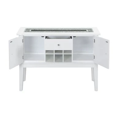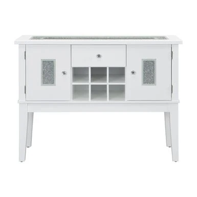 Featuring horizontal stripes of embedded faux crystals on the doors that glimmer from every angle. Two doors, a drawer and wine storage provide plenty of storage space. If you need a server, it is the best choice. Marvelous and glamorous, the Elizaveta dining table is one to leave guests speechless. Featuring horizontal stripes of embedded faux crystals on the base that glimmer from every angle. The beautiful tabletop is just as impressive, with the same faux diamonds as the base to glam up dinnertime. The white high gloss finish is the perfect slate for any decor style. Set includes: One (1) sever Materials: MDF, Tempered Glass and Acrylic Finish: White High Gloss Weight: 104.91 lbs Dimensions: 48″W x 18″D x 36″H Drawer inner dimension: 14″W x 13″D x 4″H Storage inner dimension: 14″W x 15″D x 16″H Tempered glass thickness: 7mm Number of drawer: 1 Number of door: 2 Number of wine bottle storage: 6 Side metal drawer glide 1/2 Extension Drawer Safety stop included Door magnetic strip included Weight Capacity: Overall – 200Lbs; Drawer – 6Lbs