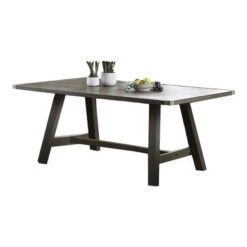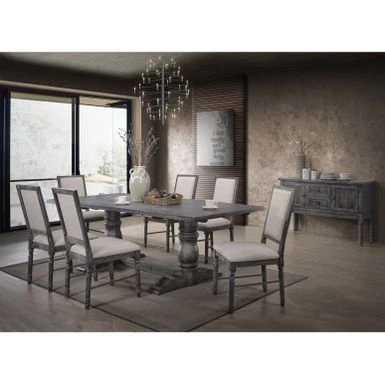 The Leventis II dining table is an eye-catching mix of convenience and style that will anchor any dining room. This beautiful rectangular table features a weathered gray finish and is complemented by a sturdy trestle with double turned pedestal base. The Leventis II dining table is an eye-catching mix of convenience and style that will anchor any dining room. This beautiful rectangular table features a weathered gray finish and is complemented by a sturdy trestle with double turned pedestal base. The rectangular table merges high quality with high design for a fresh twist that has a modern touch. This sleek table will also enhance your interior with its stunning finish that will highlight your decor and elevate the level of comfort.