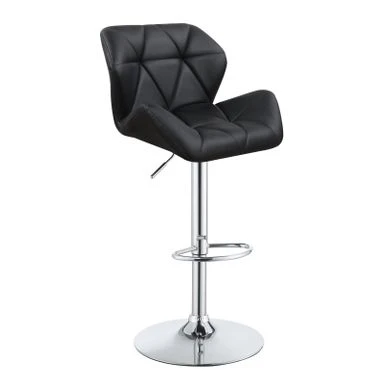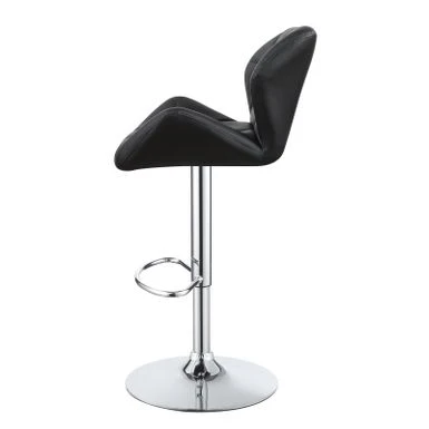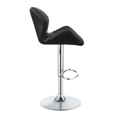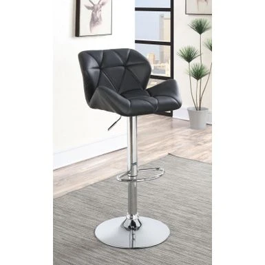 Invite cozy comfort and subdued glamour into your home with this modern, adjustable bar stool. Luxe, leather-like upholstery is adorned with stylish tufting, giving it a pleasingly updated look. Its metal base boasts graceful lines and a shining chrome finish to balance out its elegant design. A simple, round foot pedestal provides a comfortable place to rest your feet. Easily adjustable to accommodate tables, bars, and counters of all heights, this stool is a versatile option for any dining area.