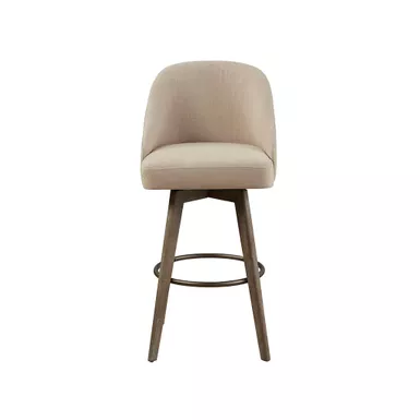 Beautifully crafted, the Apollo Barstool with Swivel Seat introduces a perfect blend of simplicity and sophistication. This barrel style counter stool features a swivel function, allowing you to easily rotate the rectangular seat. Soft sand-hued upholstery and a smooth reclaimed grey finish on the rubber wood legs create a clean transitional look, while a matt silver metal ring provides the perfect footrest. The smooth and graceful curves of this counter stool form an elegant silhouette that adds a handsome touch to your dining room. Assembly is required. Max weight capacity: 300 lbs.