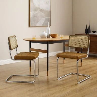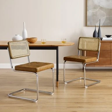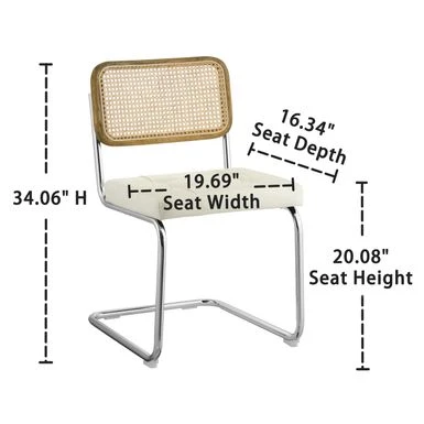 The Cesca dining chair is inspired by classic Bauhaus designs of Marcel Breuer. The cantilevered metal design is perfect for casual dining spaces. The perfectly balanced metal frame provides sturdy support for the faux leather seat. A durable solid rubber wood frame surrounds the woven cane back. This reproduction of Marcel Breuer’s classic 1930’s design is made to provide design lovers with an affordable alternative without sacrificing quality.