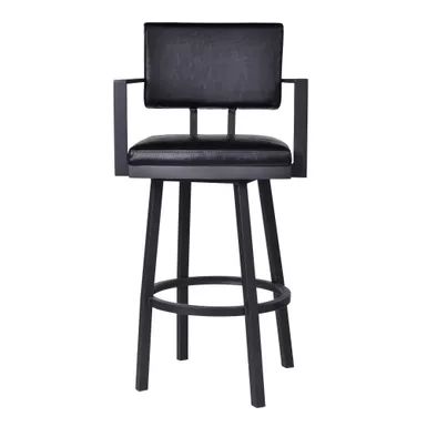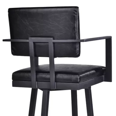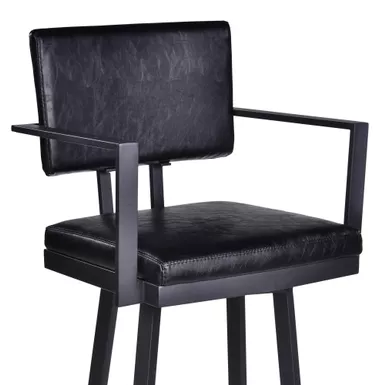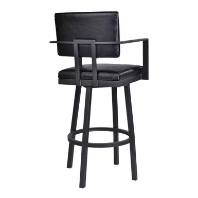 The Armen Living Balboa 26″ Counter Swivel Vintage Black Faux Leather and Metal Bar Stool with Arms is the perfect addition for any modern household. The clean lines create a sleek silhouette that easily blends into any home regardless of existing style theme. The high-density foam cushioned seat and back are wrapped in luxurious vintage black faux leather allowing comfortable seating for hours on end. This stool features a 360-degree swivel mechanism, allowing for enhanced mobility while seated, allowing you to easily engage with your guests regardless of their place in the room. The Balboa’s legs include a round footrest and come tipped with floor protectors, making sure that the barstool will not damage hardwood or tile floors when moved. The Balboa counter stool easily pulls up to any kitchen island, peninsula counter, or home bar and will last for many years to come.