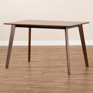 A simple, streamlined design makes the Britte dining table an easy addition to any dining space. Made in Malaysia, the Britte is constructed from durable rubberwood and comfortably seats up to four. A simple, streamlined design makes the Britte dining table an easy addition to any dining space. Made in Malaysia, the Britte is constructed from durable rubberwood and comfortably seats up to four. A walnut brown finish and rectangular tabletop lend modern style while providing ample elbow room to each member of the table. The Britte requires assembly and is supported by splayed legs that add a dose of mid-century appeal. Featuring a compact size, the Britte dining table is well suited for smaller nooks and dining rooms.. Mid-century modern dining table seats up to four (4) Style: mid-century Materials: rubberwood Color: walnut Constructed from rubberwood Walnut brown finish Rectangular tabletop Splayed legs Includes: one (1) dining table Assembly: assembly required Care instruction: wipe clean Dimensions: 29.50″ high x 47.20″ wide x 29.50″ deep Legs: 28.80″ high Product weight: 39.7 lbs.