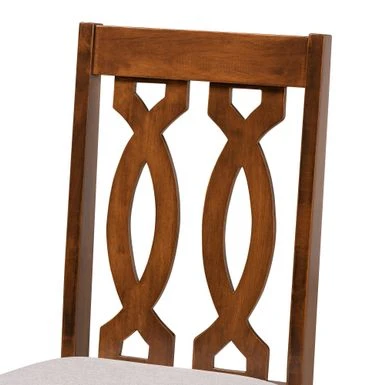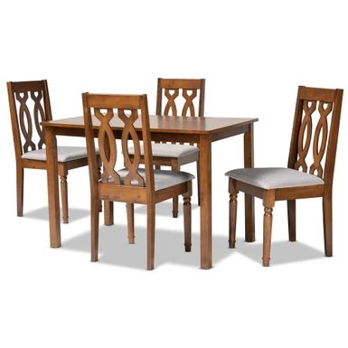 Elegance and comfort define the Cherese dining set. Made in Malaysia, this wooden set includes one table and four chairs. The chairs are upholstered in a light fabric that complements the warm walnut brown wood finish. Elegance and comfort define the Cherese dining set. Made in Malaysia, this wooden set includes one table and four chairs. The chairs are upholstered in a light fabric that complements the warm walnut brown wood finish. Designed with both comfort and style in mind, each chair features a plush foam-padded seat, as well as an exquisite cut-out design on its back. Turned legs add a classic, refined touch. Requiring assembly, the large, rectangular tabletop provides plenty of elbow room for each member at the table.. Set includes four (4) dining chairs and one (1) table Style: modern Materials: fabric “polyester 100%”, oak, foam, rubberwood, mdf Color: grey, walnut brown Constructed from oak wood, rubberwood, and engineered wood Walnut brown finish Upholstered in polyester fabric and padded with foam Cut-out back design Includes: one (1) table; four (4) dining chairs Assembly: assembly required Care instruction: spot clean Table dimensions: 29.13″ high x 43.31″ wide x 27.56″ deep Chair dimensions: 38.6″ high x 18.7″ wide x 19.3″ deep Seat dimensions: 17.9″ high(from floor) x 18.7″ wide x 15.7″ deep Back: 19.7″ high Legs: 16.9″ high Product weight: 92.5 lbs.