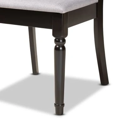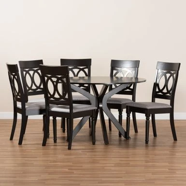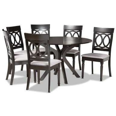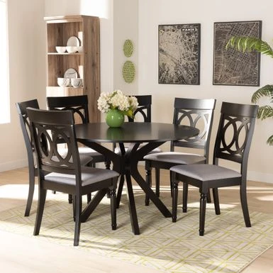 Enhance your dining space with the elegant style of the Jessie dining set. Made in Malaysia, this wooden set includes six dining chairs and one table. Each chair is upholstered in a light fabric that complements the rich dark brown finished wood. Enhance your dining space with the elegant style of the Jessie dining set. Made in Malaysia, this wooden set includes six dining chairs and one table. Each chair is upholstered in a light fabric that complements the rich dark brown finished wood. Designed with both comfort and style in mind, each chair features a plush foam-padded seat, as well as an exquisite cut-out design on its back. Requiring assembly, the round tabletop provides ample elbow room for each member of the table. Well suited for both casual meals and formal dining, the Jessie dining set is an excellent upgrade to the modern home.. Enhance your dining space with the elegant style of the Jessie dining set. Made in Malaysia, this wooden set includes six dining chairs and one table. Each chair is upholstered in a light fabric that complements the rich dark brown finished wood. Designed with both comfort and style in mind, each chair features a plush foam-padded seat, as well as an exquisite cut-out design on its back. Requiring assembly, the round tabletop provides ample elbow room for each member of the table. Well suited for both casual meals and formal dining, the Jessie dining set is an excellent upgrade to the modern home.. Style: Modern Materials: fabric “polyester 100%”, oak, foam, rubberwood Color: grey, dark brown Constructed from oak wood, rubberwood, and MDF wood Dark brown finish Upholstered in polyester fabric and padded with foam Cut-out back design Includes: one (1) dining table; six (6) dining chairs Assembly: assembly required Care instruction: spot clean Table dimensions: 30.00″ high x 44.90″ wide x 44.90″ deep Legs: 29.1″ high Chair dimensions: 38.6″ high x 18.7″ wide x 22″ deep Seating dimensions: 17.9″ high (from floor) x 18.7″ wide x 15.7″ deep Back: 20.7″high Legs: 16.9″ high Product weight: 120.3 lbs.
