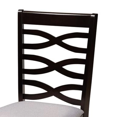 Cool geometric forms are paired with elegant tones in the Leda dining set. Made in Malaysia, this wooden set includes one table and four chairs, each upholstered in a light fabric that complements the dark brown wood finish. Cool geometric forms are paired with elegant tones in the Leda dining set. Made in Malaysia, this wooden set includes one table and four chairs, each upholstered in a light fabric that complements the dark brown wood finish. Designed with both comfort and style in mind, each chair features a plush foam-padded seat, as well as a striking cut-out design on its back. The round tabletop is supported by an intersecting base, creating a chic, sculptural effect. Requiring assembly, the Leda dining set is well suited for both casual and formal dining… Dining set includes one (1) table and four (4) chairs Style: modern Materials: fabric linen “polyester 100%”, rubberwood, mdf, foam Color: grey, dark brown Constructed from oak wood, rubberwood, and MDF wood Dark brown finish Upholstered in polyester fabric and padded with foam Round tabletop Includes: one (1) dining table; four (4) dining chairs Assembly: assembly required Care instruction: spot clean Chair dimensions: 37.4″ high x 17.7″ wide x 20.9″ deep Seating dimensions: 18.5″ wide x 16.1″ deep x 18.5″ high (from floor) Back: 19.7″ high Legs: 16.9″ high Table dimensions: 29.9″ high x 35.4″ wide x 35.4″ deep Legs: 29.1″ high Product weight: 81.5 lbs.