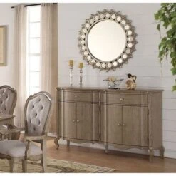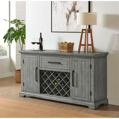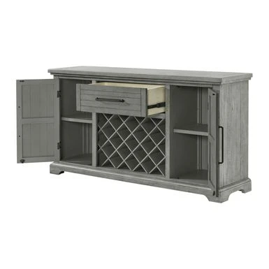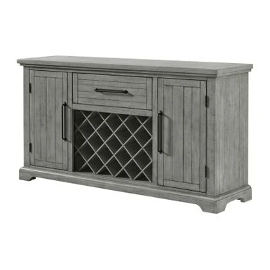 The Beach House Server is a Coastal Casual styled piece based on beach houses from Nantucket to San Diego. The server is finished in a beautiful Dove Grey with planking, and is constructed from solid New Zealand Pine for extra durability. This sideboard offers plenty of storage space with two cabinets with adjustable and removable shelves for multiple configurations. There is also room for your finest wines. The top drawer features a custom designed drawer pull that is reminiscent of old iron drop swing bars found on dock chests, and is the drawer is lined in felt to protect your silverware and other goods. The English Dovetail constructed drawer interior is built of sturdy plywood, sanded and sealed with lacquer and operates on ultra-smooth gliding, full extensions ball-bearing drawer guides. The server ships fully assembled, so its ready for your dining room or kitchen right away. Dimensions: 65 L x 18 D x 35 H; Made in Vietnam.