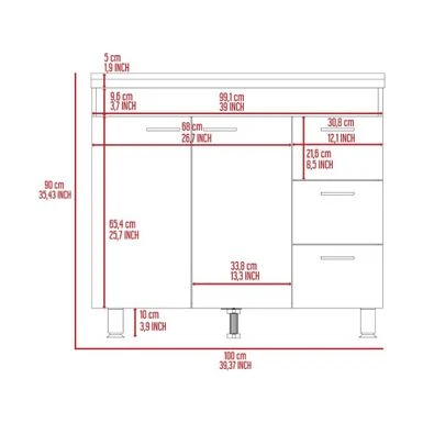 With its exclusive design, The Boahaus Balve Base Cabinet comes with a handy hole specially designed for your faucet on its ample aluminum countertop (39,37”W X 20,67′ ‘D), made of a unique combination of white resistant particleboard. With its exclusive design, The Boahaus Balve Base Cabinet comes with a handy hole specially designed for your faucet on its ample aluminum countertop (39,37”W X 20,67’ ‘D), made of a unique combination of white resistant particleboard.This base cabinet is the perfect storage solution for your kitchen supplies! It features a contemporary design that will complement any decor, and its ample storage space with three drawers (12,1”W X 8,5”H)provides plenty of room to store all your supplies. The cabinet is also easy to assemble, so you can start using it immediately.Exclusive size (39,37”W X 20,67”D X 35,43”H)