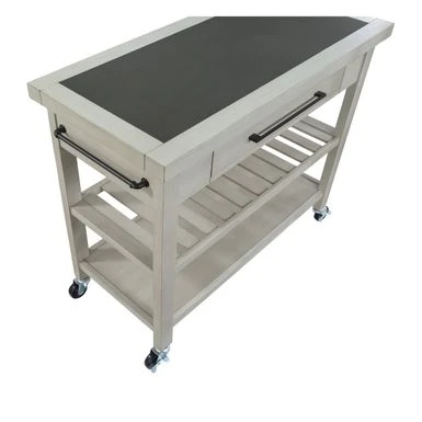 Capturing the classic charm of the modern farmhouse aesthetic, our Kitchen Island with composite top, combines beauty and functionality. Its multi-functional design makes it perfect for food preparation, serving, and kitchen storage. Beautiful from every angle, it features a 4-step had rubbed painted finish, contrasted with the clean lines of a durable dark charcoal composite food prep surface. Handy single large push-through drawer will hold all your cooking utensils. Two lower-level open shelves are ideal for displaying extra-large pots, large mixing bowls and serving pieces. Black towel bar and heavy-duty hardware will provide long lasting appeal. Â A must-have addition to any home, this charming kitchen island is sure to be your new favorite place for both cooking and storage.