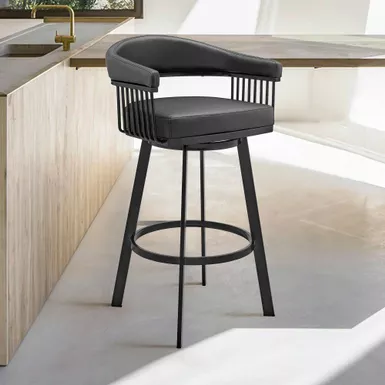 Bring the Bronson Swivel Bar Stool from Armen Living into your beautiful home! It is the best choice to bring in another seating option and does so without compromising on comfortability. The wonderful faux leather and metal accents give the Bronson a look of refinement, making you proud to show it off in your home. The foam-padded seat cushion offers you the most comfort available to you! This curved open-back stool will keep you relaxed while enjoying dinner with your friends and family. The Bronson also features a convenient metal footrest, for additional support and stability.