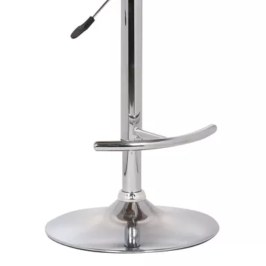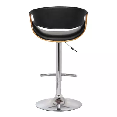 Add a touch of Mid-Century Modern glamour to your home with the Butterfly Adjustable Swivel Black Faux Leather and Walnut Wood Bar Stool with Chrome Base from Armen Living. High-density foam cushions on the back and seat are wrapped in soft faux leather upholstery. The curved padded medium high back is ideal for posture alignment and an unmatched support for days on end. The adjustable seat height lever allows you to easily find a seat at your kitchen island, peninsula counter, or home bar. The 360-degree swivel motion allows you to easily engage with your friends and family regardless of their place in the room! The walnut wood arms wrap around the bottom of the seat, giving a true Mid-Century Modern feel to the kitchen bar stool. The sturdy chrome pedestal base keeps you firmly planted while the faux leather upholstery makes for easy cleanup, making this the perfect addition to any home!