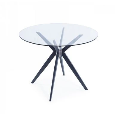 The Dallas dining table features 12mm clear round tempered glass top, stainless steel support base, formed of crossed X’s held together by a cylindrical support where the intersect. The dining table features 12mm clear round tempered glass top, stainless steel support base, formed of crossed X’s held together by a cylindrical support where the intersect. The Dallas comes in 2 base finish options: Brushed Stainless Steel or Black-Powder coated stainless steel, and seats up to 6.