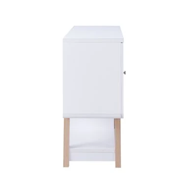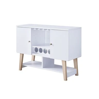Entertain, store, organize, and stylize your dining space in dashing, mid-century modern style, with this fabulous buffet server. The two-tone frame boasts open shelving, two cabinets, and angled legs. Store your favorite glasses and wine bottles in the center storage area.