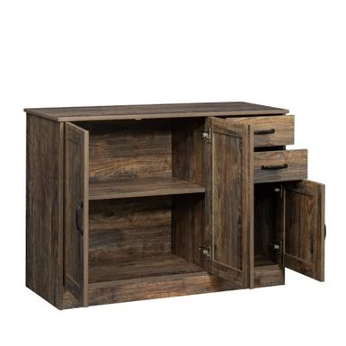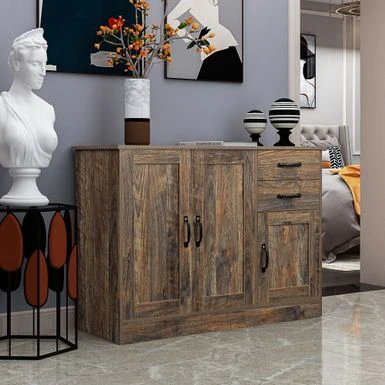 Wooden side cabinet with movable shelves, doors and drawers: 3 doors and 2 drawers, 1 movable partitionwhich provide more space to storage.This practical side cabinet locker is designed with movable shelves and open doors, and 1 hidden shelf is used for storing household units, space utilization and dust prevention.