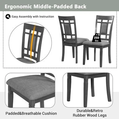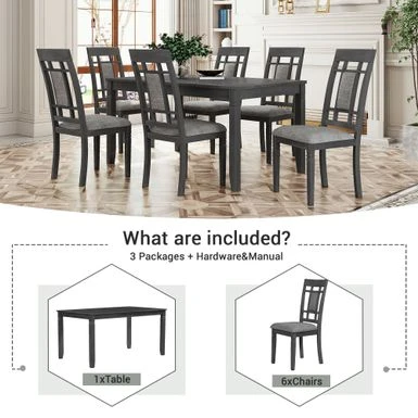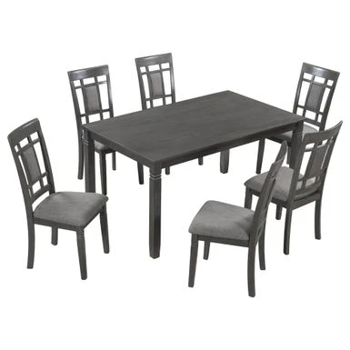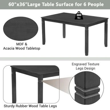 - This farmhouse dining table set creates a rustic decor and an classical feeling with its gray finish to your dining room. Measured with a 60x36inch large rectangular dining table and padded dining chairs, this dining set is comfortable for 6 people seating. Engraved texture of these rubber wood table legs provides not only sturdiness but decorative look.