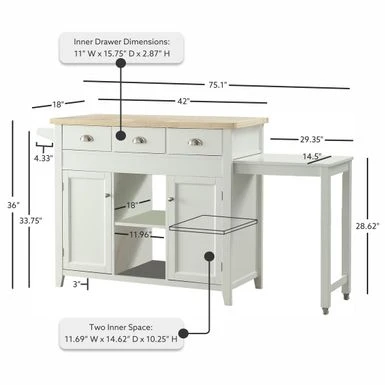 - Abundant storage including two drawers, a large cabinet space with two shelves, and a produce basket