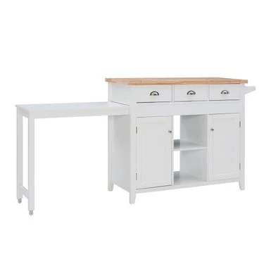 Make a simple upgrade to your kitchen with this Copper Grove Kitchen Cart. Its simple lines, clean white finish, and silver hardware help this farmhouse-style kitchen cart blend into any decor. A food-safe natural wood top offers serving space plus room for a compact microwave or coffee maker. You’ll find ample storage space in two top drawers plus a large enclosed cabinet with sliding doors, two adjustable shelves, and one produce basket. This appealing cart also includes a convenient towel rod, a side storage rack, and casters for easy mobility.
