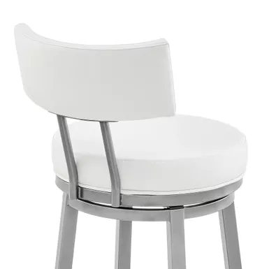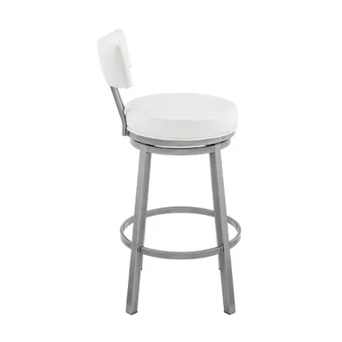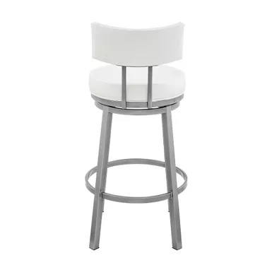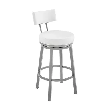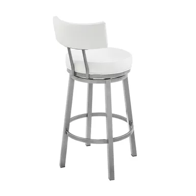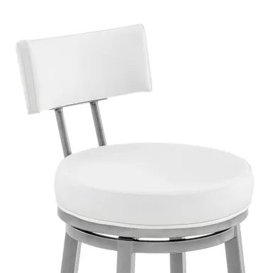 Embrace the modern and functional appeal of the Dalza Swivel stool in Faux Leather and Metal by Armen Living. The bar stool features a padded and streamlined back, resting upon 4-sturdy legs to serve as modern and comfy addition to your home. Its generously padded back and seat are topped with nearly tailored faux leather upholstery. Faux leather does not crack or fade easily; it is stain-resistant and UV resistant to serve you for years to come. Compliment any bar, high dining area, or adjustable desk with the elegance and charm of our metal bar stool. Crafted with quality and comfort in mind, the barstool can be used anywhere from the kitchen and living area to your workspace. A wonderful full 360-degree swivel function allows for maximum mobility. The smooth glide swivel function allows you to change directions with ease to become your new favorite seat.