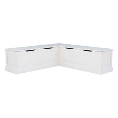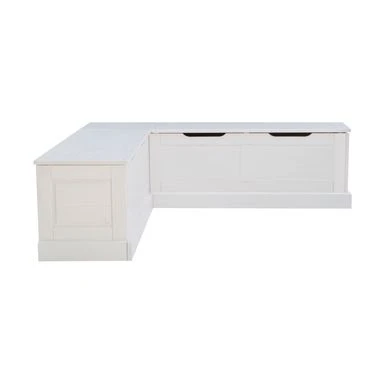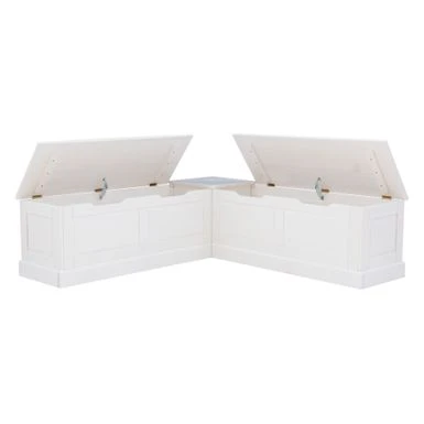 This breakfast nook creates the perfect place to relax with a cup of coffee or gather with friends over lunch. Cottage and farmhouse style will complement any round, rectangle or square table you would like to pair it with. Backless to provide ultimate flexibility with its surroundings, this solid white piece offers the look of built-ins without the cost or hassle. The solid pine seats open up to reveal hidden storage for extra placemats or seasonal decorations. Conveniently comes in one box. Matching table available