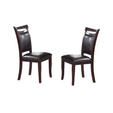The dining chair is upholstered in dark espresso faux leather framed in a wood finish. Add style to your dining room with this piece. It has a contemporary style and is a perfect choice for any dining room. Sold in a convenient set of two. The dining chair is upholstered in dark espresso faux leather framed in a wood finish. Add style to your dining room with this piece. It has a contemporary style and is a perfect choice for any dining room. Sold in a convenient set of two.