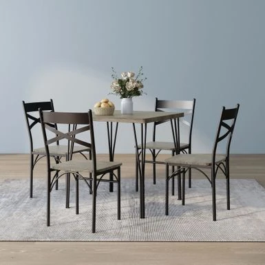 Create a modern and compact dining space with the DENHOUR BASIC Small Space 4-Person Dining Set. The metal frame of the chairs and table ensure stability and durability, while the printed veneer seats and table top add a warm touch to your home.