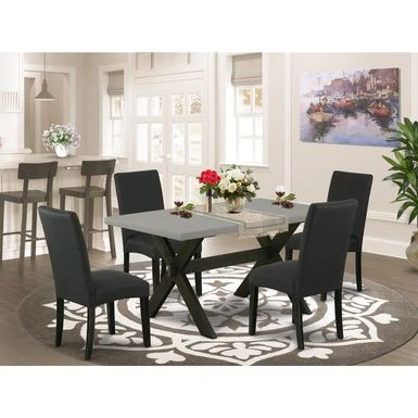 East West Furniture 5-Piece Dining Room Set- 4 Upholstered Dining Chairs with Black Linen Fabric Seat and Stylish Chair Back – Rectangular Table Top & Wooden Cross Legs – Cement and Black Finish
