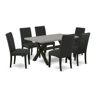 East West Furniture 7-Piece Modern Dining Set- 6 Upholstered Dining Chairs with Black Linen Fabric Seat and Stylish Chair Back – Rectangular Table Top & Wooden Cross Legs – Cement and Black Finish