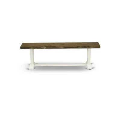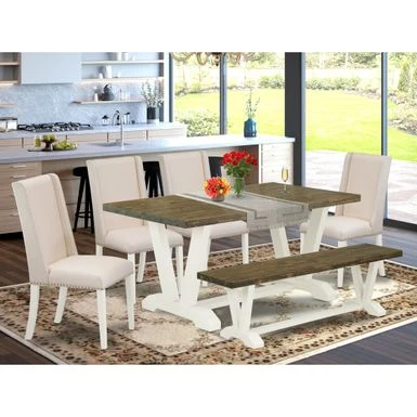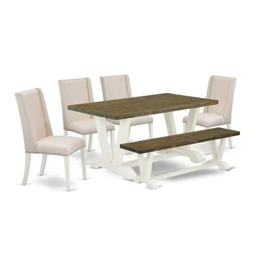 East West Furniture 6-Piece Fashionable an Excellent Distressed Jacobean Dining Table Top and Distressed Jacobean Wood Bench and 4 Gorgeous Linen Fabric Kitchen Parson Chairs with Nails Head and Stylish Chair Back, Linen White (off white) Finish