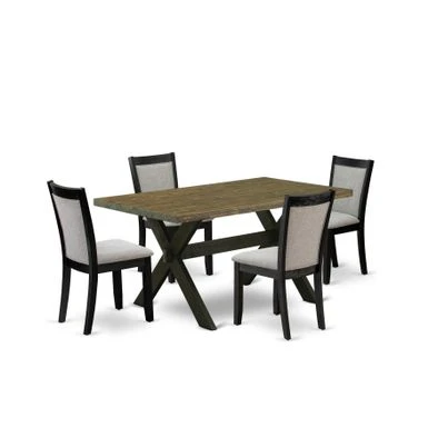 East West Furniture 5 Piece Modern Dining Set – A Distressed Jacobean Top Dining Table with Trestle Base and 4 Shitake Linen Fabric Kitchen Chairs – Wire Brushed Black Finish