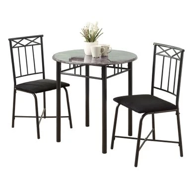 This chic three piece bistro set offers a classic look that will blend in with any dining décor. The round table features a grey marble-look top and sturdy noir metal legs. The two armless metal side chairs are accented with a circular design and a vertical slat back with cushioned black upholstered microfiber seating for your comfort. The clean lines of this set will create a cozy ambiance you will love!