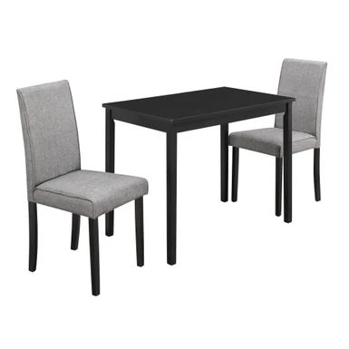 The key to enjoying quality time with a special person is this 3-piece dining set in black and grey that blends with any kitchen or dining room décor style. With its modern and sturdy solid wood legs, solidity is no issue with this thick panel table top that is made for seating two people. In a compact rectangular size, it is the right table to enhance the overall look and feel in tighter spaces of your apartment, condo or small home. The simplistic matching Parsons chairs boast a rich grey linen material featuring thick padding.
