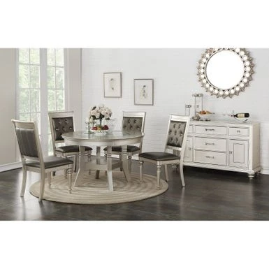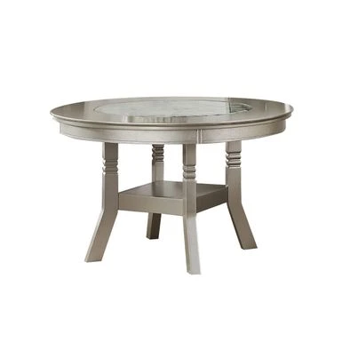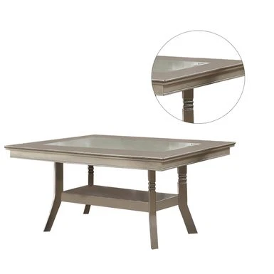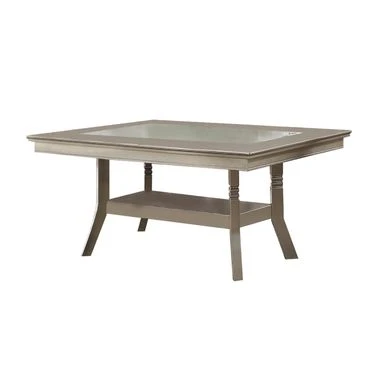 Elevate your dining space with this stunning Dining Table with Glass Inserted Top in Antique Silver. Its modern design and high-quality construction make it perfect for hosting intimate gatherings or casual family dinners. The antique silver finish and glass top add a touch of elegance to any room, while the square open shelf provides ample storage space for dinnerware or decor.