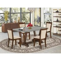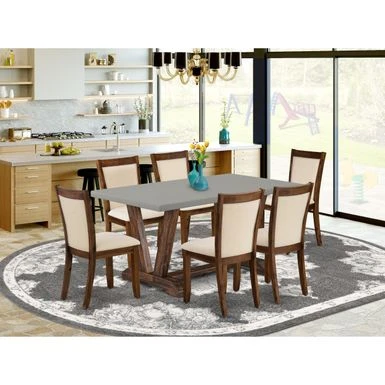 Add a touch of modern elegance to your dining room with the East West Furniture Dinette Set. This set includes a rectangular table with a cement top and V-style legs in a distressed Jacobean finish, along with parson dining chairs that feature light beige linen fabric seats and sand blasting antique walnut solid wood legs. The stylish chair backs are outlined in a wooden frame and padded in the center for comfort. Made with high-quality Asian hardwood and crafted by experienced carpenters, this set offers both durability and timeless style. Choose from different pieces options to best fit your needs.