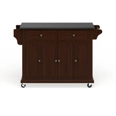 Add to your home with this solid black granite top kitchen cart/island. This kitchen cart/island has a stylish design and a rugged construction. The abundant storage space is matched with a granite top for a resilient work space as elegant as it is functional.
