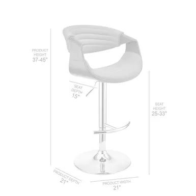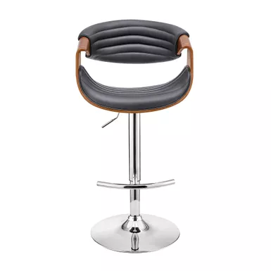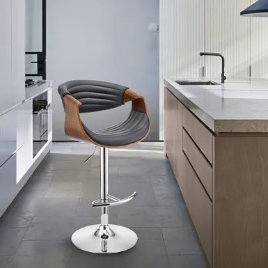 The Gionni Adjustable Swivel Gray Faux Leather and Walnut Wood Bar Stool with Chrome Base is an ideal addition to any home or apartment. The adjustable seat height functionality allows you to use this stool at your kitchen island, home bar, or peninsula without having to worry about the surface height. The convenient swivel function optimizes everyday use or entertaining, keeping everyone engaged regardless of their place in the room. The plush padded and high-density foam seat and back rest atop a strong pedestal base that creates a sturdy and comfortable seating experience. Wrapped in luxurious faux leather upholstery and complimented by beautiful wood accents, the Gionni stool has a mid-century silhouette exudes timeless beauty that will last for many years to come.