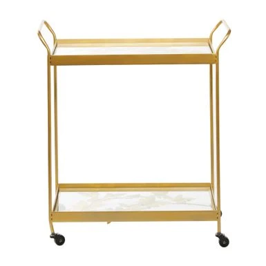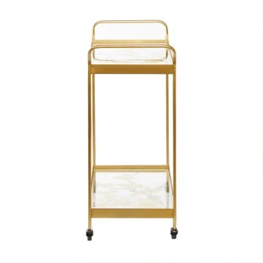 Your eclectic inspired living space deserves a delightful addition in the form of this luxurious gold metal and glass serving cart. This 2-tier metal frame cart with glass surfaces features a sleek and streamlined design perfect for your interior design. The serving cart features 4 multi-directional wheels on each of the four main metal support poles. The glass surface features butterfly etchings for a more unique experience. This will look exemplary in your living room or kitchen as a serving tray or as a decor stand. This item comes shipped in 1 carton. Suitable for indoor use only. Each shelf can hold up to 15 lbs. This bar cart features 2 rectangular shelves. Contemporary design.