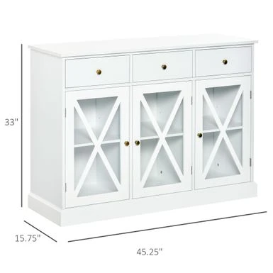 Tune into modern farmhouse living with this sideboard from HOMCOM. This storage sideboard fits nicely with any dcor and can be used in the kitchen, dining room, or living room to create stylish additional storage. This buffet server comes with 3 drawers and an enclosed cabinet to store daily accessories, utensils, dry goods, as well as plates and dishes. The framed glass doors bring elegance and class to your kitchen design. Enhance your storage today with HOMCOM.