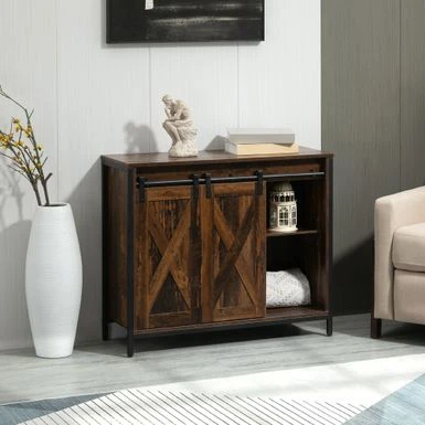 Introduce industrial style and practicality to your living space with the HOMCOM Industrial Sideboard. This storage cabinet with sliding barn doors offers a rustic charm while providing ample space for storing daily accessories and utensils. Customize your storage needs with the adjustable shelves that move to accommodate items of different heights. Made of MDF and powder-coated steel frame, this sideboard is sturdy, easy to clean, and has an anti-tipping design to prevent accidental falls. Use it as a coffee table, bar cabinet, dining room server, or TV console. Assembly is required.