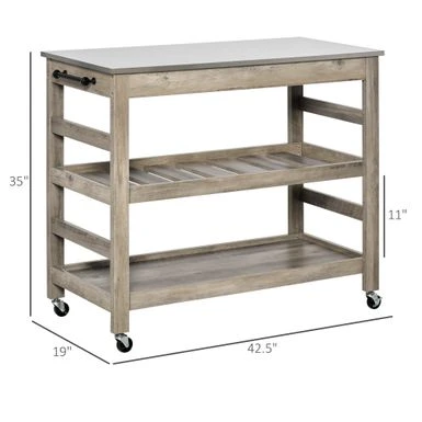 This kitchen cart is compact and ideal for small spaces needing a bit more storage. features two shelves to store kitchen utensils and dishware. The stainless steel tabletop is easy to clean and spacious enough to prepare your ingredients. Caster wheels glide to any room of the house.