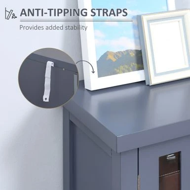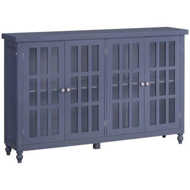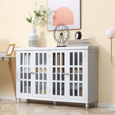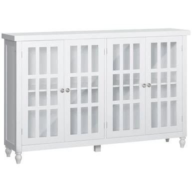 Add style and functionality to your kitchen with the HOMCOM Modern Kitchen Sideboard Buffet Cabinet. This cabinet features four framed glass doors that provide a clear view of your stored items while keeping them safe and dust-free. The adjustable shelves inside the cabinet offer customizable storage space to fit your needs. The wide tabletop provides extra space for displaying or serving food, making it perfect for hosting guests. With its elegant design, this buffet cabinet can be used as a dining room server, bar cabinet, or bookcase, and is suitable for any room in the house.