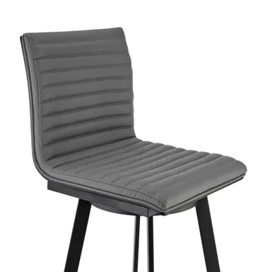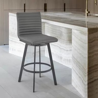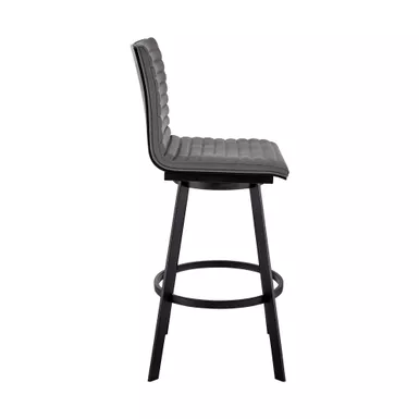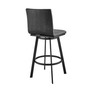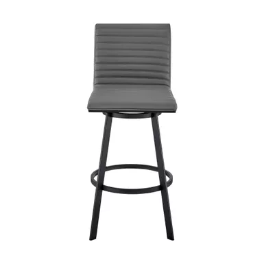 Bring the Jermaine Swivel Bar Stool from Armen Living into your beautiful home! It is the best choice to bring in another seating option and does so without compromising on comfortability. The wonderful faux leather and metal accents give the Jermaine a look of refinement, making you proud to show it off in your home. The foam-padded seat and back cushion offers you the most comfort available to you! The Jermaine also features a brushed wood veneer back and convenient metal footrest, for additional support and stability.