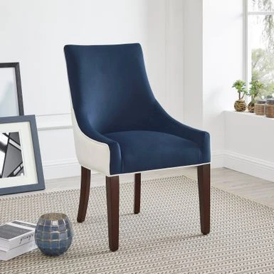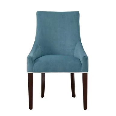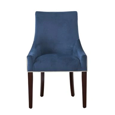 Upgrade the style of your dining area with the Julianna Upholstered Dining Chair by Greyson Living. This chair boasts a modern design with a subtle curved silhouette and flared back legs that make it an eye-catching addition to any space. The chair is upholstered in plush, two-tone polyester fabric that is durable and easy to clean. It features deeply sloped arms and stylish welted seams that add to its contemporary look. The solid hardwood legs are finished in walnut and come with protective floor glides. Give your dining area a stylish upgrade with this modern dining chair.