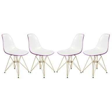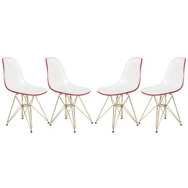 Experience the perfect blend of modern style and comfort with the LeisureMod Cresco Plastic Dining Chair Set of 4. This set features clear molded shells that form sleek lines and curves, making for an ergonomically designed chair that takes pressure off the back and thighs. The flexible back and deep seat pocket, supported by elegant hand brushed gold color chrome legs, make these chairs ideal for stylish and comfortable seating. Suitable for indoor or outdoor use, these chairs come with protective floor pads on all four legs, ensuring stability and comfort. With simple assembly required, these chairs are the perfect addition to any contemporary kitchen or dining room.