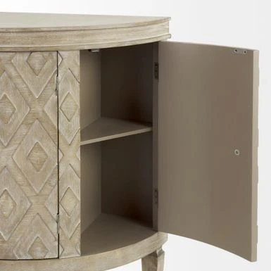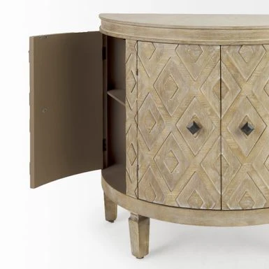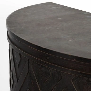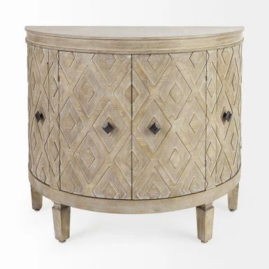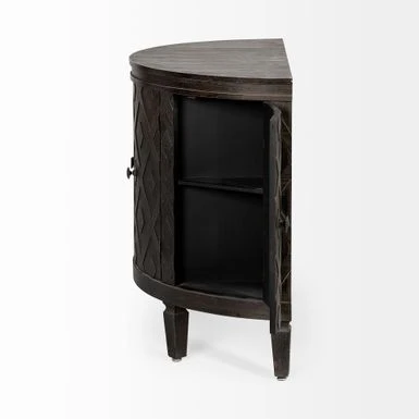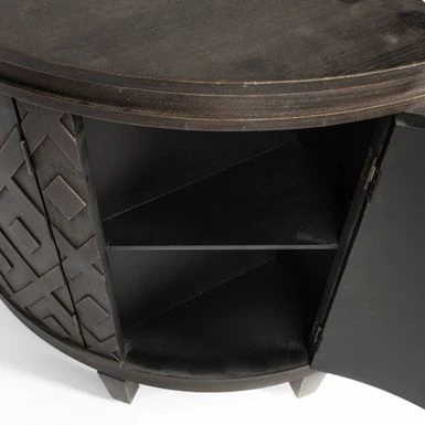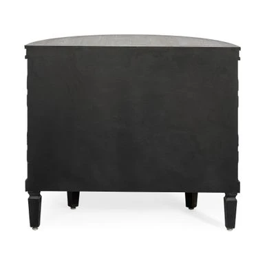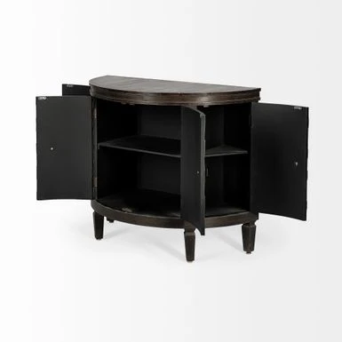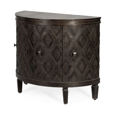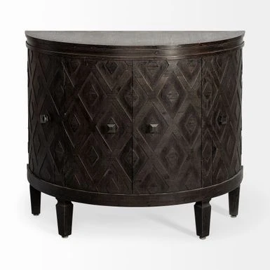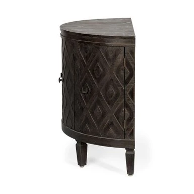 Wooden demilune / half-moon cabinet with black finish with raised diamond pattern and 4 doors and matching legs. Wooden demilune / half-moon cabinet with black finish with raised diamond pattern and 4 doors and matching legs.