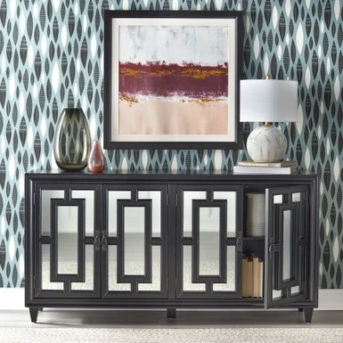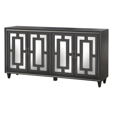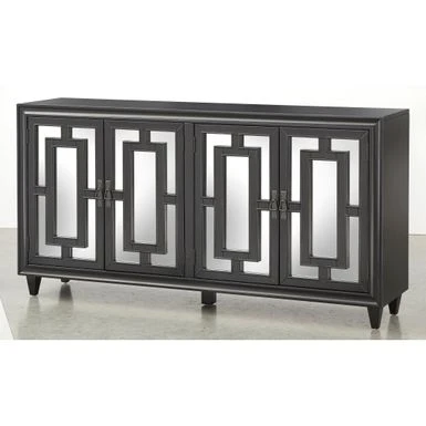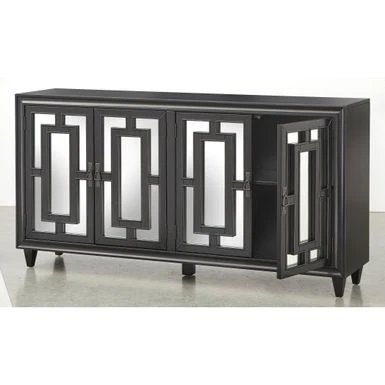 The Lifestorey Lavoy Buffet/Sideboard creates a stunning accent in your dining room, while also offering convenient storage space. The Lifestorey Lavoy Buffet/Sideboard creates a stunning accent in your dining room, while also offering convenient storage space. Mirrored-glass door fronts are the defining feature, adding a striking sophistication with their rectangular frame pattern. Four doors open to reveal two cabinet areas with an adjustable shelf in each. It’s great for storing bowls, drinkware, dinnerware sets and serveware. Durably crafted with solid pinewood legs and veneered MDF in a black finish.
